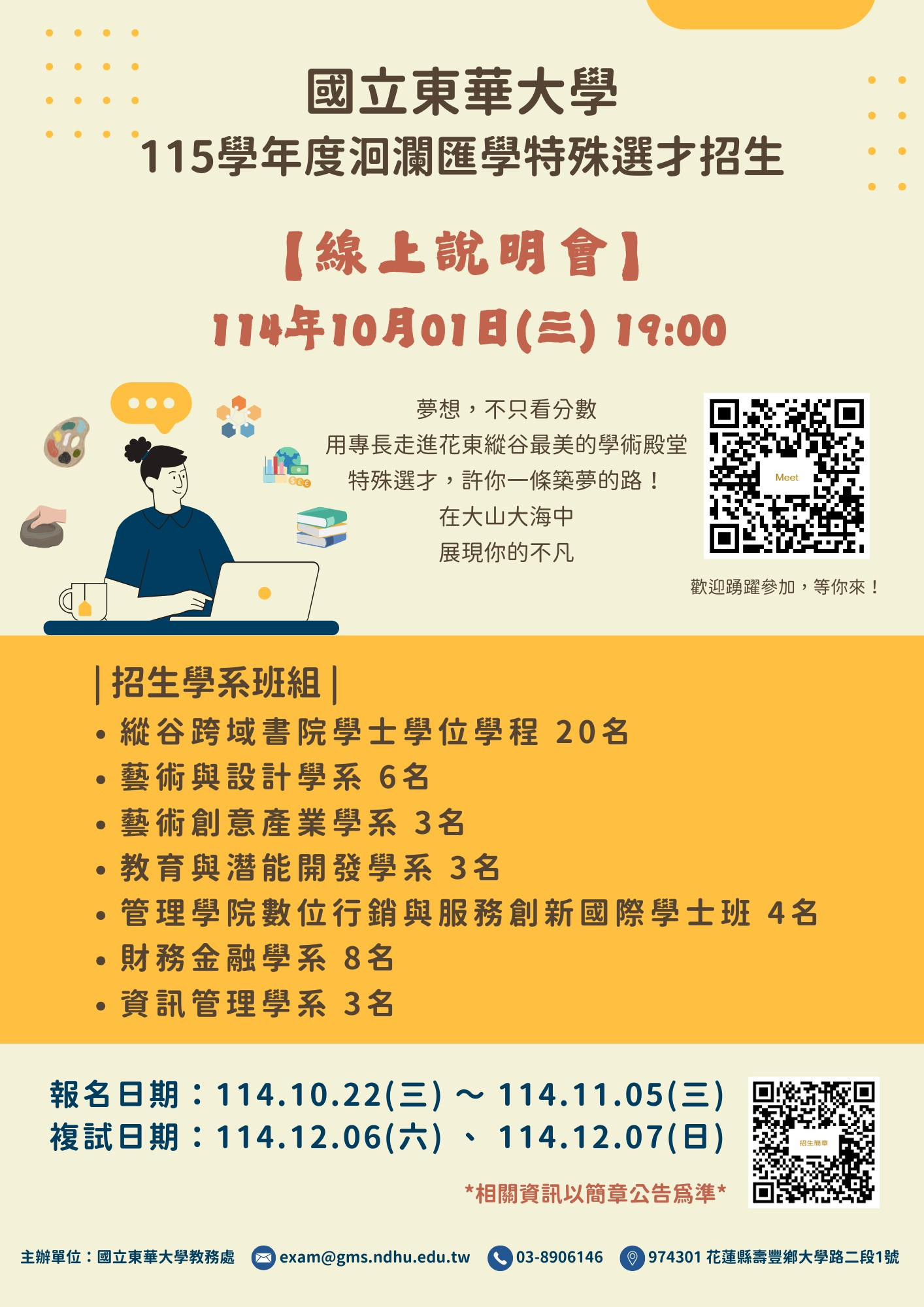 【招生】115學年度縱谷跨域特殊選才招生線上說明會