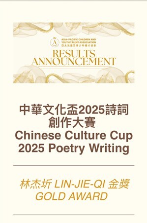 能在「中華文化盃詩詞創作大賽」中榮獲金獎,對我而言是巨大的驚喜與鼓舞。感謝亞太兒童及青少年優才協會提供青年創作者交流的平台,也感謝指導我的師長的勉勵。